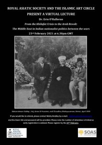 On Tuesday 23rd February, Dr. Erin O’Halloran who is a Visiting Fellow at the Bill Graham Centre for Contemporary International History, University of Toronto, will be giving a virtual lecture entitled: From the Khilafat Crisis to the Arab Revolt: The Middle East in Indian nationalist politics between the wars.