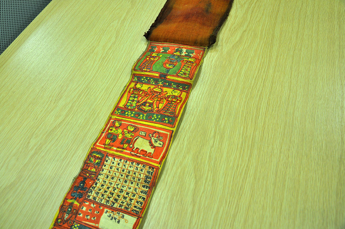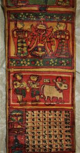 The scroll is small measuring only 12 cm in width but it is 205.74 cms in length. It has three painted panels with a bare-footed grey-blue Krishna (with the arms holding what appears to be a flute) in the centre, flanked by two female figures (gopis) on either side. Below this is a panel depicting the deity Ganesh, flanked by Riddhi and Siddhi. The lower-most of the three panels depicts two women on the left hand side of the picture, and a cow on the right, with a small rectangle bearing the word ‘Ram’ in Devanagari script in the top-upper half in the middle of the panel. Below these three panels, is a panel containing the opening portion of the almanac. This fourth panel is written in black ink, with a narrow painted border to its left and contains zodiac-related information including the position of Mars. It also tells us that the almanac/horoscope is for the year Samvat 1875, Saka 1740 (corresponding to c. 1818 A.D.)