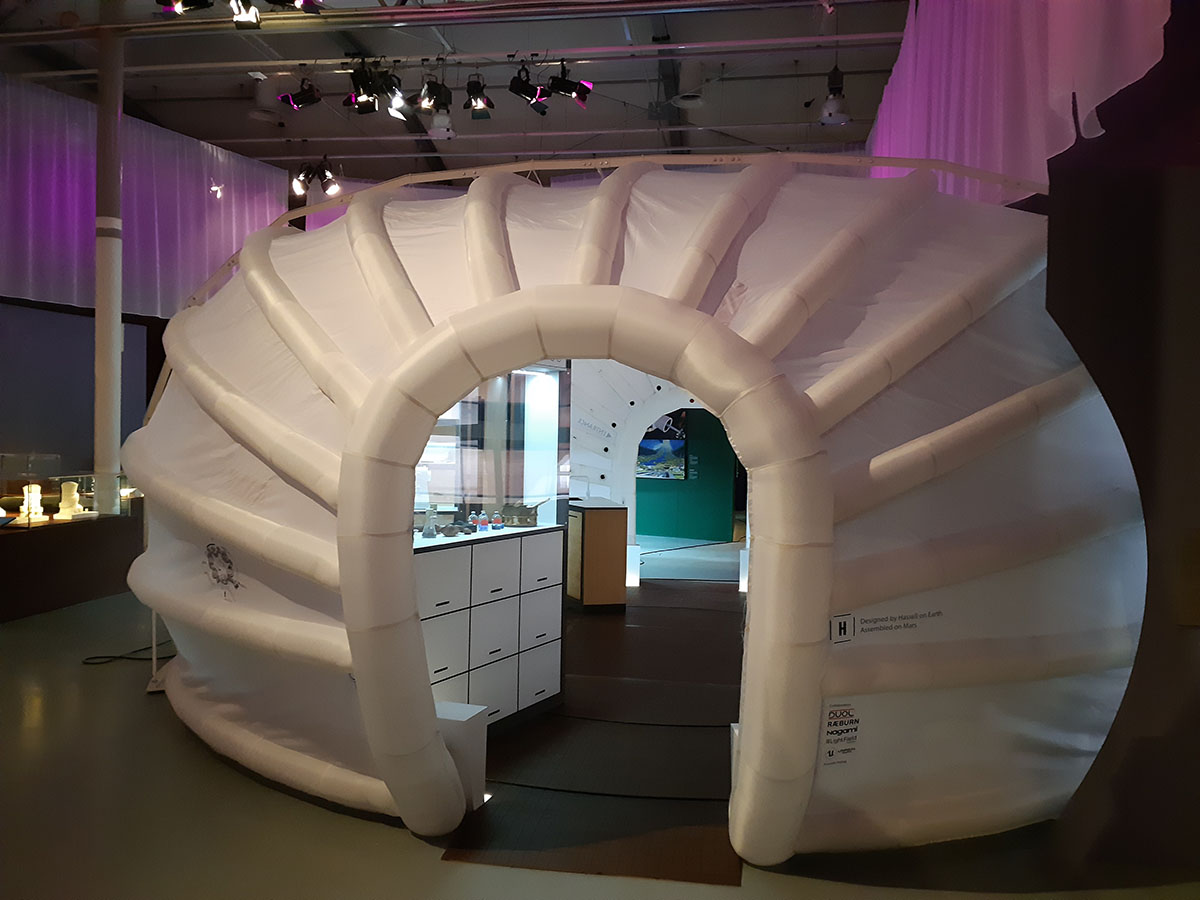 The Tekniska museet in Stockholm is the first stop on the tour for the exhibition, ‘Moving to Mars’ by the Design Museum in London. This exhibition tells us about Mars and humans. For thousands of years, this planet has fascinated people. It has been depicted on stone carvings, in books and in art. In popular culture, there are many examples of movies and music where Mars is a central element. Going forward in time, as technology developed, humans were able to study the planet through telescopes, and later came satellites and rovers. There are now even thoughts about colonizing Mars. Could humans really live on this hostile planet? One of the key exhibits in the exhibition is the Hassell Mars habitat inflatable living pod where visitors can go in and experience what a home on Mars could look like from the inside.