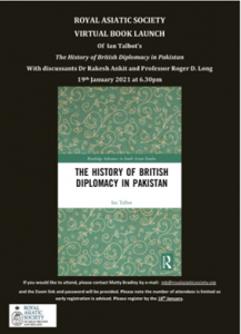 On Thursday, 19th January at 6.30 pm, the Society was pleased to hold a launch for Professor Ian Talbot’s most recent book, ‘The History of British Diplomacy in Pakistan,’ Taylor and Francis, 2021. Professor Talbot, who is a member of the RAS Council, was joined by Professor Roger Long (Eastern Michigan University) and Dr. Rakesh Ankit (Loughborough University) to discuss aspects of this first account of the British diplomatic mission in Pakistan in the aftermath of Empire.