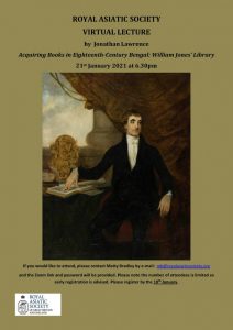 On the 21st January, Jonathan Lawrence will be giving a lecture to the Society on: ‘Acquiring Books in Eighteenth-Century Bengal: William Jones’ Library.’ This lecture is based on a recent article Lawrence wrote for the Journal of the Royal Asiatic Society about Sir William Jones and the Arabic and Persian manuscript collection that he acquired both before arriving in India in 1784, and during his time living in Kolkata. Sir William was also the founder of the Asiatic Society of Bengal in 1784. The Society holds material from Sir William within the archives, this includes a sales catalogue of the William Jones library where parts of his collection were sold at auction following his death.