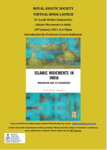 While we are coming to the end of 2020, the Society is starting to put together a programme of events and lectures that will be held next year. For the time being, these will continue to be held virtually, pending future Government announcements. The first of these will be a book launch on Friday 29th January of Islamic Movements in India by Dr. Arndt Emmerich. This book analyses the emerging trend of Muslim- minority politics in India and suggests that a fundamental shift has occurred over the last 20 years from an identity-dominated, inward-looking approach by Muslim community leaders, Islamic authorities and social activists towards an inclusive debate centred on socio-economic marginalisation and minority empowerment.