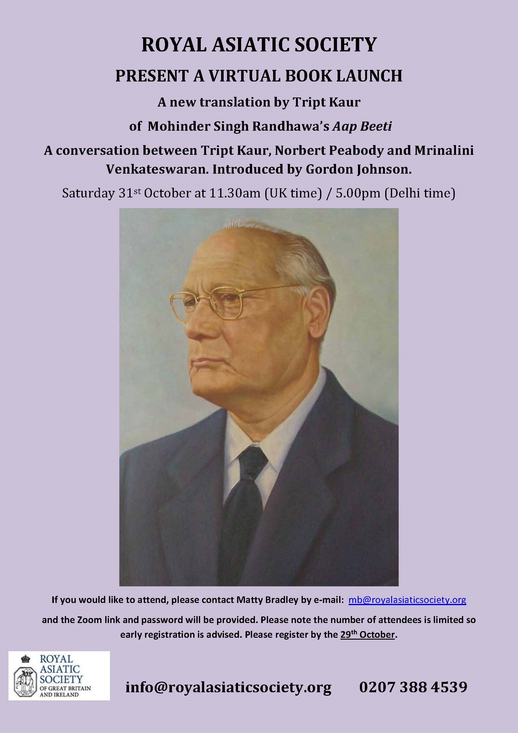 This brings us on to the most recent translation which has been published by the help of the fund. Aap Beeti, the autobiography of Mohinder Singh Randhawa has recently been translated into English from the Punjabi by Tript Kaur. The translation was organised by Mrinalini Venkateswaran who is a fellow of the society.