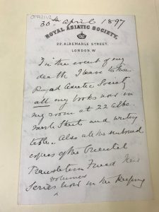 The collections contain a large volume of written correspondence from Arbuthnot which showcase his commitment towards making accessible valuable translations of Asian manuscripts. Arbuthnot’s dedication to this work led to him donating his own private collections of manuscripts to the Asiatic society upon his death whilst also transferring the existing stock and copyright of the fund to the society. This is covered in the final written correspondence that we have from Arbuthnot in the collection.