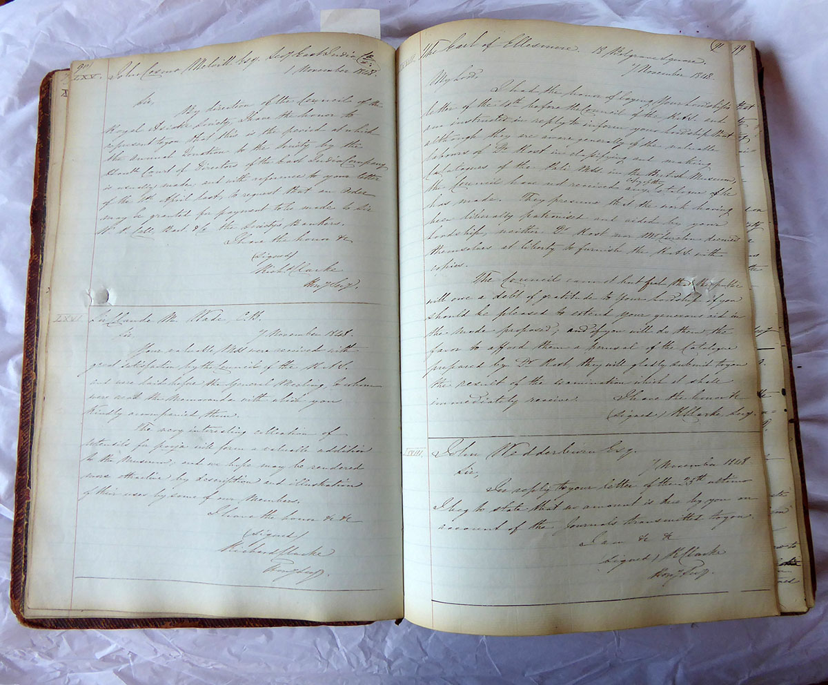 I have continued to work to enhance the archives and I thought I would take the opportunity this week of completing the report on the progress in sorting the Institutional Archives which I began in a previous blog post. I have already written about the archives connected to the Allied Societies, Awards and Medals, Collections, Finance, Governance, the Journal, and Lectures and Events, but to add an update on these – this week has seen the addition of a further catalogue for the Governance records: RAS GOV4: Royal Asiatic Society Governance: Correspondence Volume One is now available on Archives Hub. This lists 500 letters from the early business correspondence of the Society.