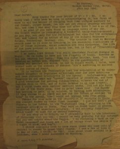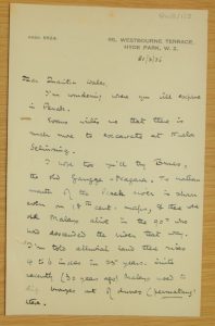 Besides the many institutional records in which Winstedt’s name came be found, he is also linked with two sets of personal papers. The first are those of Horace Geoffrey Quaritch Wales, an administrator and archaeologist. In 1936 we find Winstedt corresponding with Quaritch Wales over the possibilities of excavation in Perak, Malaysia (GB 891 QW/6/1/2). In 1937, he writes again to congratulate Quaritch Wales on receiving a grant to fund the excavation and suggesting the Kedah area as a possible fruitful place (GB 891 QW/6/1/4). Winstedt continues to correspond with Quaritch Wales through 1938 whilst Quaritch Wales was out in Malaysia including suggesting he writes an article for the Journal of the Royal Asiatic Society (GB 891 QW/6/1/24).