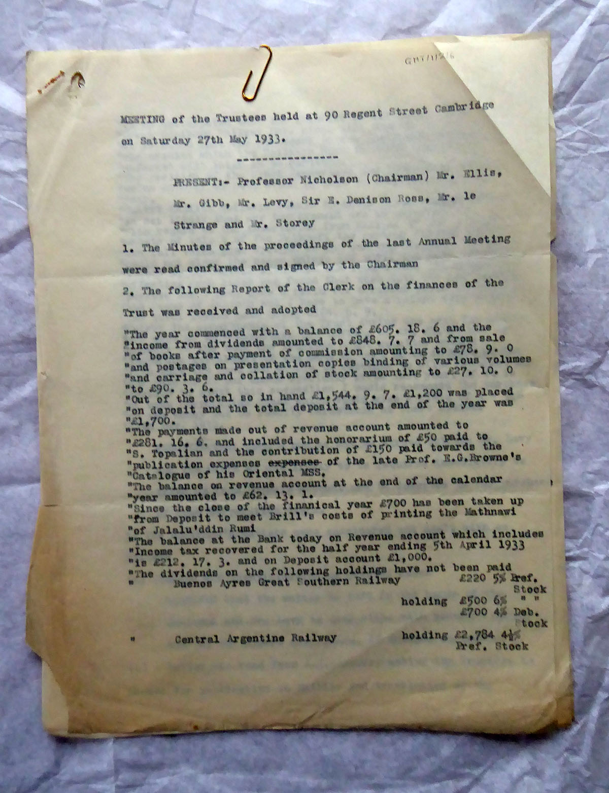 Of particular interest within these papers are the record of the Trust’s activities during World War II. Some of the trustees were no longer in the country, trustees meetings were suspended, and there were considerable difficulties getting books published and bound. The trustees, at that time headed by Reynold Alleyne Nicholson, set up a system of sending round items for discussion in lieu of meetings, in much the same way that our Society is currently coping with cessation of meetings due to the pandemic. Nicholson, a renowned Rumi scholar, was based in Towyn, North Wales. He had been unable to return to Cambridge as could not find any rooms to rent in the town. Storey, however, was still in Cambridge and much of the practical work of the trustees seemed to fall on him.
