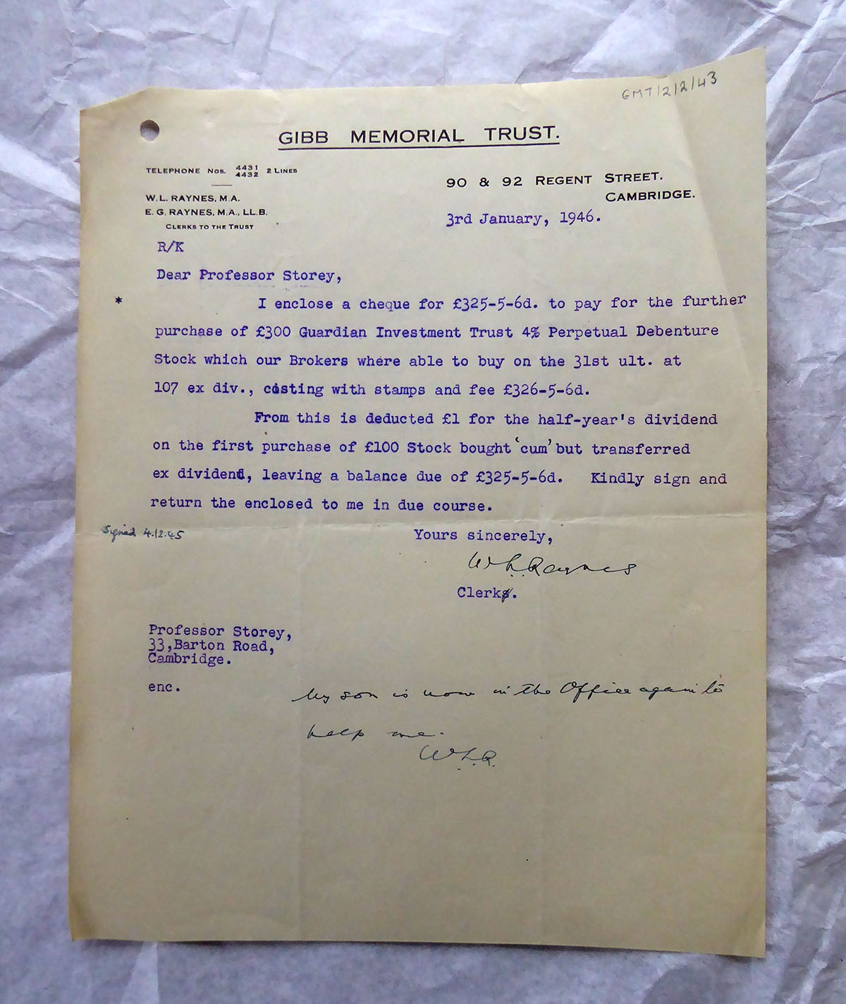 The Trust used the solicitors, W.L and E.G. Raynes, to carry out their administrative business. Father and son, working from Cambridge, E.G. Raynes, it seems, was being groomed to take over his father’s business. However when WWII broke out, E.G. Raynes disappeared from the office, presumably to serve in the armed forces and his father took up all the reins again. I’m pleased to report that E.G. Raynes made it back to resume his position as the note on this letter of the 3rd January 1946 informs: