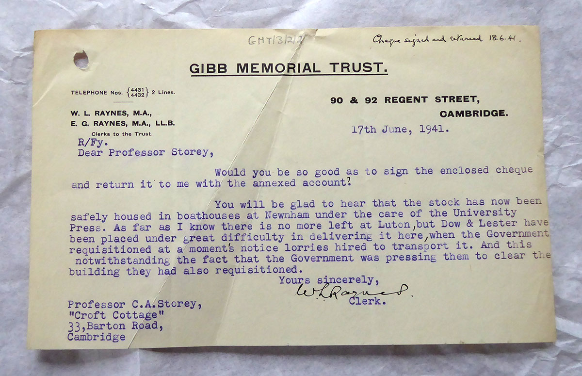 During the War years, the Trust undertook a publication of Vladimir Minorsky’s translation of Tadhkirat al-Mulūk: A Manual of Ṣafavid Administration (GMS, N.S. 16, 1943). There is considerable correspondence between Minorsky and Storey as the overseeing trustee and also with the publishers and binders as they try to source paper and boards for publication and find time to undertake the work. It seems that the government requisitioned the buildings of the publishers Dow and Lester in Luton, and the Trust stock was rehoused in the boathouses at Newnham, Cambridge and into the care of the University Press. Some of you local to the area, may well be able to picture where that is.