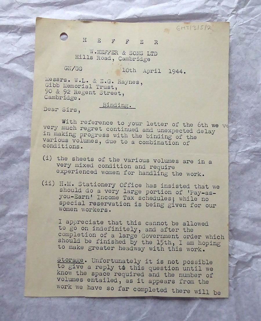 Work transferred to W. Heffer & Sons Ltd. but they faced shortages of material which were needed for government publications and, it seems, were often required to print government publications at short notice. The Gibb Memorial Series, at this time, were published with elaborate bindings embossed with gold lettering. Correspondence covers finding where the spine brasses for the lettering have been left and which need to be newly cut. For other volumes that the Trust wanted binding, they also experienced delays because of the shortage of skilled binders due to the need for experienced women workers who have no special reservation on the ‘Pay-as-you-earn’ Income Tax schedule from H.M. Stationery Office.