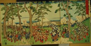 The scene shows cherry blossom time in Asukayama, which opened in 1737 as a park. Over a 1000 cherry trees were planted in the early eighteenth century by the shogun Tokugawa Yoshimune (1684-1751) so that the people of Edo could come here to drink and eat under the trees. Hiroshige captures the crowds visiting the park, many carrying parasols decorated with cherry blossoms and in the background small groups are seated on mats eating and drinking.