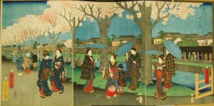 This print depicts ladies walking in cherry blossom time along the banks of the Tama River (actually the Tama River Aqueduct), which carried much of the drinking water for the city of Edo along a thirty-mile course. The cherry trees were planted along much of the embankment in the 1730s. The placement was not only aesthetic but also practical as the trees’ roots strengthened the banks, and their petals and leaves were thought to possess antitoxic powers that kept the water pure.