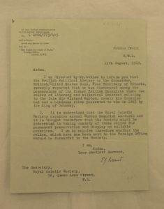 However, the matter was dropped with the onset of the Second World War. It re-surfaced in the Cold War when the status of Trieste was contested between Western and Eastern blocs. The former British consulate had by this time been converted into the ‘Office of the British Political Adviser to the Commander, British/United States Zone, Free Territory of Trieste’. Not only was space in this building at a premium but any ‘appearance of a museum of antiquities’ was deemed inappropriate for an office ‘situated … in an area of tension very close to a potentially explosive border’. So it was that the Foreign Office revived the pre-war proposal to transfer the Burton relics to the RAS and in August 1949 the Society accepted ‘custody of [Burton’s hat and stick] for permanent preservation and display on suitable occasions’.