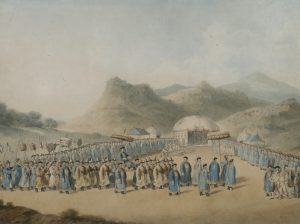 Two of the artworks in our Collections illustrate some of those key moments in Staunton’s life. The first is a watercolour by William Alexander (1767-1816). Alexander was a Royal Academy student who was selected to accompany the Macartney embassy to China (1792-4). He made many drawings of the journey, some of which were engraved and used in Staunton’s account of the embassy. Other drawings were published in Alexander’s own publications. The artwork in the Society’s possession is entitled “The Approach of the Emperor of China to his Tent in Tartary to receive the British Ambassador”, dated by Alexander to 1799.