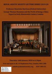 Our first lecture in 2020 will be on Thursday 16 January, 6.30 pm, when Professor Henrietta Harrison from Oxford University will talk on “George Thomas Staunton ad the Perils of being a China Expert in early nineteenth-century London.” Staunton played an important part in the early life of the Royal Asiatic Society, so it will be interesting to discover more about him from Professor Harrison.