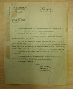 The main focus for my cataloguing on to Archives Hub in the last few weeks has been material associated with Societies that are, or have been, allied with the Royal Asiatic Society. This morning I finished the catalogue for the Royal Asiatic Society China. This was founded as the Shanghai Literary and Scientific Society, in 1857, and became affiliated to the Royal Asiatic Society the following year, becoming the Royal Asiatic Society (North China Branch). This material I catalogued was collated in the interaction of the two Societies; the closure of the North China Branch in 1952 and subsequent questions regarding it closure; and in its reopening in 2006 and subsequent contact with the Royal Asiatic Society.