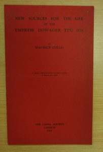 This is the text of a lecture delivered before the China Society in London, on 21 March 1944. Its author, Maurice Stewart Collis (1889 – 1 1973) was an administrator in Burma from 1912-1934 and afterwards a writer on China, Southeast Asia and other historical subjects. He begins this lecture, “New Sources for the Life of the Empress Dowager Tz’ŭ Hsi” by reminding his audience of a play that he had published in 1943 entitled, “The Motherly and Auspicious”, the title being a translation of Tz’ŭ Hsi. It appears that Backhouse had been questioning the sources that Collis had used! So within the lecture, Collis sets out to detail his sources, and goes to some lengths to establish the authenticity of some of them. He also points out that many of these sources were unavailable at the time of the Bland and Backhouse book.