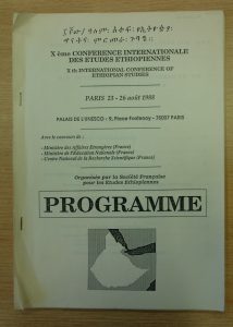 From more recent history, we have records for the Tenth International Conference of Ethiopian Studies held at the Palais de l’UNESCO, Paris from 23-26 August 1988. Richard Pankhurst, a former Honorary Librarian of the Royal Asiatic Society, and a Ethiopian scholar, was one of the many participants to read a paper at the Conference. Our collections include the Programme for the Conference, and most of the abstracts and a few full copies of the papers read. The International Conference of Ethiopian Studies is a series of gatherings that takes place every three years. Traditionally, every third conference is held in Ethiopia, but we only have records for their tenth conference.