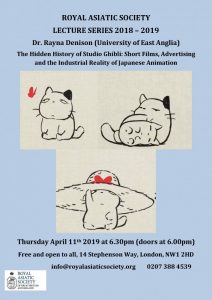 On a completely different note, we look forward this evening to welcoming Dr. Rayna Denison from the University of East Anglia. She will be lecturing on “The Hidden History of Studio Ghibli: Short Films, Advertising and the Industrial Reality of Japanese Animation”. Studio Ghibli’s films have become famous around the world, but their animation production in other areas remains obscure. Ghibli, like most animation studios in Japan, supplements its feature film production by doing animation-for-hire. These ancillary productions take some unusual and varied forms. On the one hand, they have produced high profile advertisements for clients, and even animated music videos for Japanese bands, while on the other they have produced animation shorts, exclusively shown at the Studio Ghibli Art Museum in Mitaka, Tokyo. This lecture examines the different economic, aesthetic and corporate influences that can be traced across these shorts in order to think about how Studio Ghibli’s famous house style of animation is impacted by the industrial realities of Japanese animation production. We hope that many will join us this evening for such an interesting topic.