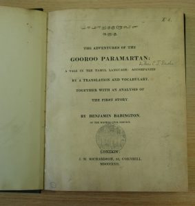 So, why is the Royal Asiatic Society interested in remembering this esteemed doctor, Benjamin Guy Babington? Well, it seems that Babington, alongside his medical career, maintained his interest in India and Asia. He had been a fellow of the Madras Literary Society and became a Fellow of the Royal Asiatic Society in 1824. He served as its Secretary, in the early days of the Society, from 1826-1828 after the death of G.H. Noehden. Besides publishing medical texts he also published the pamphlet, “Remarks on the geology of the country between Tellicherry and Madras” and, in collaboration with Costantino Guiseppe Beschi, translated and published, “A grammar of the high dialect of the Tamil language, termed Shen-Tamil : to which is added, an introduction to Tamil poetry” and “Paramāṟatakuruviṉa katai: The adventures of the Gooroo Paramartan : a tale in the Tamul language : accompanied by a translation and vocabulary, together with an analysis of the first story”. We have copies of these within our Collections.