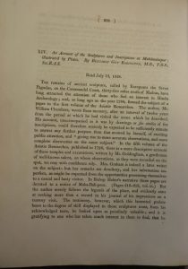 Babington also donated 11 drawings undertaken by Andrew Huddleston and himself. These were used to illustrate Babington’s paper, “An Account of the Sculptures and Inscriptions at Mahamalaipur” which appeared in the Transactions of the Society in 1830, after having been read at the Society in 1828.