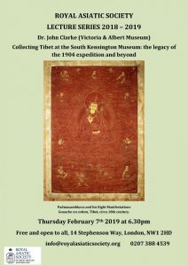 In other news, the Society would like to welcome you to a lecture on Thursday 7th February, 6.30 pm, when Dr John Clarke from the Victoria & Albert Museum will speak on “Collecting Tibet at the South Kensington Museum: the legacy of the 1904 expedition and beyond”.
