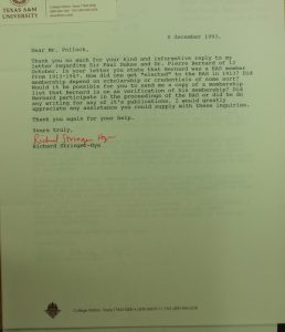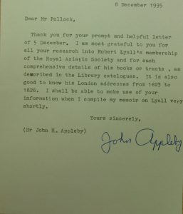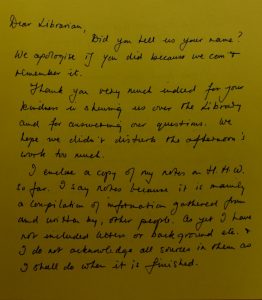 I only met Michael on a handful of occasions at lectures he attended, his tenure as librarian being over well before mine began as archivist. But in sorting through the institutional archives, I have found his ‘footprints’, as he instigated many initiatives, answered enquiries and cared for the collections. As with all positions both Edward Weech, the current librarian, and myself, as archivist, stand metaphorically on the shoulders of those who have come before us – those who embraced the idea of putting together these collections, and those who subsequently have both cared for and added to them. We are grateful for the hours spent by previous librarians making sure that these Collections are still available to researchers today. I am currently sorting through the collections research enquiries records within the institutional archives and have found many thanking Michael for his work. Here are a small selection: