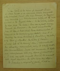 This article would be fairly easy for me now to catalogue after reading and discovering its contents. There are still a couple of mysteries that I am hoping some blog reader will be able to help clear up. Firstly who was George Hale? It does not appear that he was a Fellow of the Royal Asiatic Society and we do not seem to have any more work by him. A search of the Internet tends to bring up George Ellory Hale – the American astronomer – whose profile does not fit with this article. Further searching about archaeology and Sardis brings us potentially the name of George Dennis, an nineteenth century explorer who mostly worked on his own – again, not really helpful. So, if anyone can enlighten me as to this George Hale I would be very grateful. The second is a question of date – the paper, ink and presentation suggest this is from the nineteenth century. And the paper is watermarked for 1830, which is a very helpful clue. But it would be good to have some more accurate date as to when this expedition took place to add to the catalogue details. So, again if anyone can help…