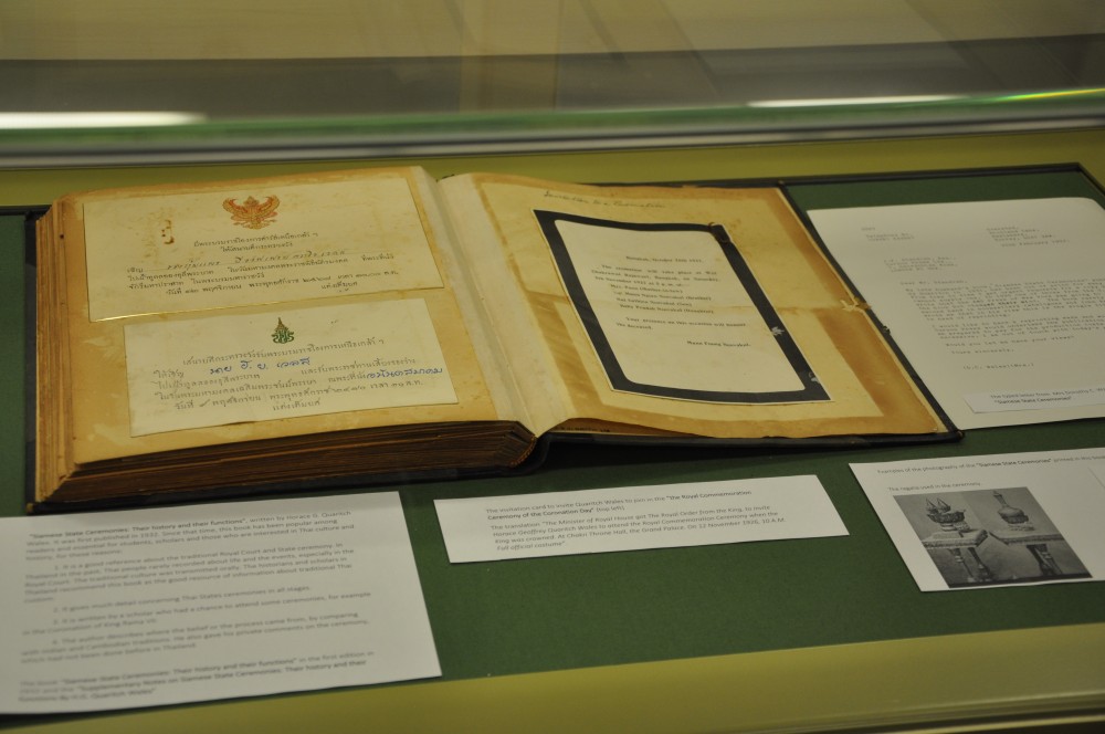 In other news, we are delighted to have a new exhibition on display in our Reading Room. This display was curated by Praphaphan Chuenkaek, who completed an internship at the Society as part of the SOAS Southeast Asian Art Academic Programme. Praphaphan did valuable work with our collections, which focussed on the listing, cataloguing, and repackaging of our holdings pertaining to the British archaeologist and historian, H.G. Quaritch Wales (1900-1981). Quaritch Wales is chiefly known for his work with South East Asian antiquities, especially in Thailand, and our new Reading Room exhibition focuses on Quaritch Wales’s first book, Siamese State Ceremonies, first published in 1931. We are very grateful to Praphaphan for all her work with the Quaritch Wales collection, and hope that visitors to the Library over the next few months enjoy looking at the display.