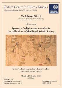 On Monday 15 October, 5 pm, RAS Librarian, Edward Weech, will be lecturing at the Oxford Centre for Islamic Studies on “Systems of Religion and Morality in the Collections of the Royal Asiatic Society”. He will examine selected treasures from the Society’s collections to make some suggestions about the approach of British Orientalists to the study of religion; how this related to eighteenth-century Enlightenment historiography and philosophy; and how this approach may have developed over the course of the nineteenth century. From this he will consider the Society’s collections in the wider context of British interest in foreign cultures and traditions, and ideas about public morality and religious pluralism. If you would like to attend this event please register your interest with the Centre.