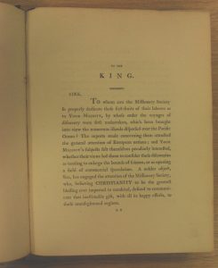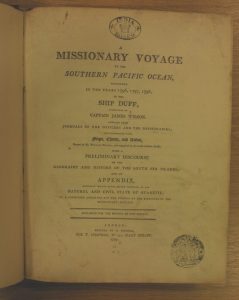 This week I went to the “James Cook: The Voyages” Exhibition at the British Library – in fact it was a family affair as I met up with my two sisters and we visited the exhibition together. It is a bit late for me to recommend it, though I do, as the exhibition closes on the 28th August. But if you have some time over the Bank Holiday Weekend and are in London, then you could avail yourself of the “bounty” of the exhibition. I learnt a lot about the voyages that Cook undertook, and something about their consequences in our global history. And I was intrigued to learn a little bit more. That is when it is advantageous to be working in a place such as the Royal Asiatic Society with its many Collections. So, although, the Southern Seas cannot be classified as Asia, I did find in our Collectioons, “A Missionary Voyage to the Southern Pacific Ocean performed in the Years 1796, 1797, 1798…”