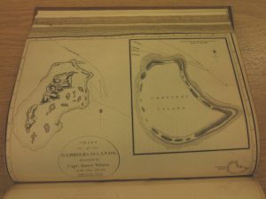 On 23rd May, they spotted land, previously unknown. The wind was light so they failed to reach it before nightfall. The next morning, “we hove the ship to, and putting two seamen in the jolly-boat, Mr Wm. Wilson and Mr Falconer, with Peter and Otaheitean Tom…rowed towards the shore, intending to land if the natives ere friendly…But on our approach they collected themselves in a body to oppose our landing. As they walked along the shore, the women followed with spears…”A decision was made not to land but the island was named “Crescent island, on account of its form; it is six of seven miles in circumference, and lies in lat. 23º 22’S. long. 225º 30’E.” This first discovery was followed by finding several more islands which were grouped together and named Gambier’s Islands, “in compliment to the worthy admiral of that name, who, in his department, countenanced our equipment”.