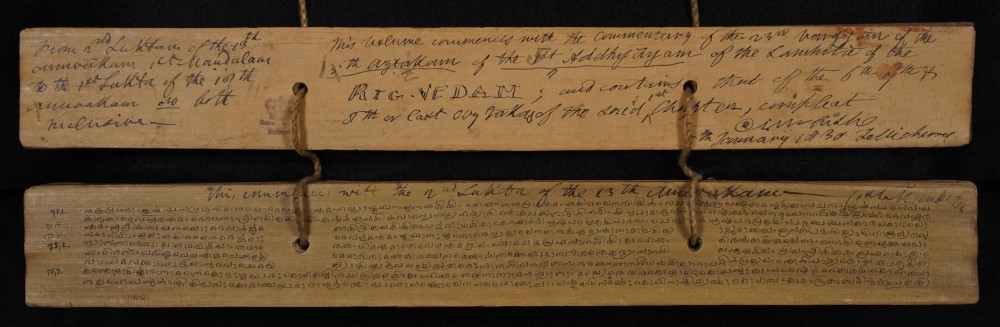 Our largest collection of palm leaf manuscripts is the Whish Collection, which comprises around 200 manuscripts collected by Charles Matthew Whish (1794-1833) in south India in the early nineteenth century. Whish was fascinated by Vedic philosophy and classical literature, the study of grammar and philology, and the history of mathematics and astronomy, and the collection reflects his interests (for more information see blog posts by Kathy Lazenbatt here and here). After his premature death at the age of 38, his collection came into the possession of his brother, J.L. Whish, who donated it to the Royal Asiatic Society in 1836. Around 50 of the Whish manuscripts have already been completely digitized, and we look forward to the rest of the collection being made available online over the coming months.