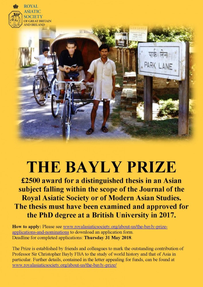 The Royal Asiatic Society is pleased to invite nominations and applications for the inaugural Bayly Prize. The award of £2,500 will be made in 2018 for an outstanding thesis in an Asian subject which falls within the scope of the Journal of the Royal Asiatic Society or of Modern Asian Studies. The thesis must have been examined and approved for the PhD degree at a British University in 2017. Full application details can be found at www.royalasiaticsociety.org/about-us/the-bayly-prize-applications-and-nominations.