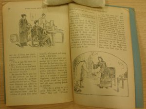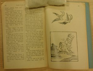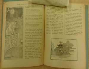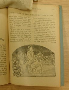 Amy suggested that the willow pattern story, which should always be told around a plate, was actually not a traditional Chinese story at all – but one made up in England to enchant potential purchasers. Within our Collections we have a little pamphlet called “Fairy Tales from China”, adapted by Marion L. Adams. This was part of a series of “Stead’s Masterpiece Library for Boys and Girls” and was bequeathed to the RAS Library by Miss Mary Lumsden in September 1931. It has several tales reputedly from China, each with illustrations. And one of those included is “The Story of the Willow Pattern Plate”. Here are some of its illustrations: